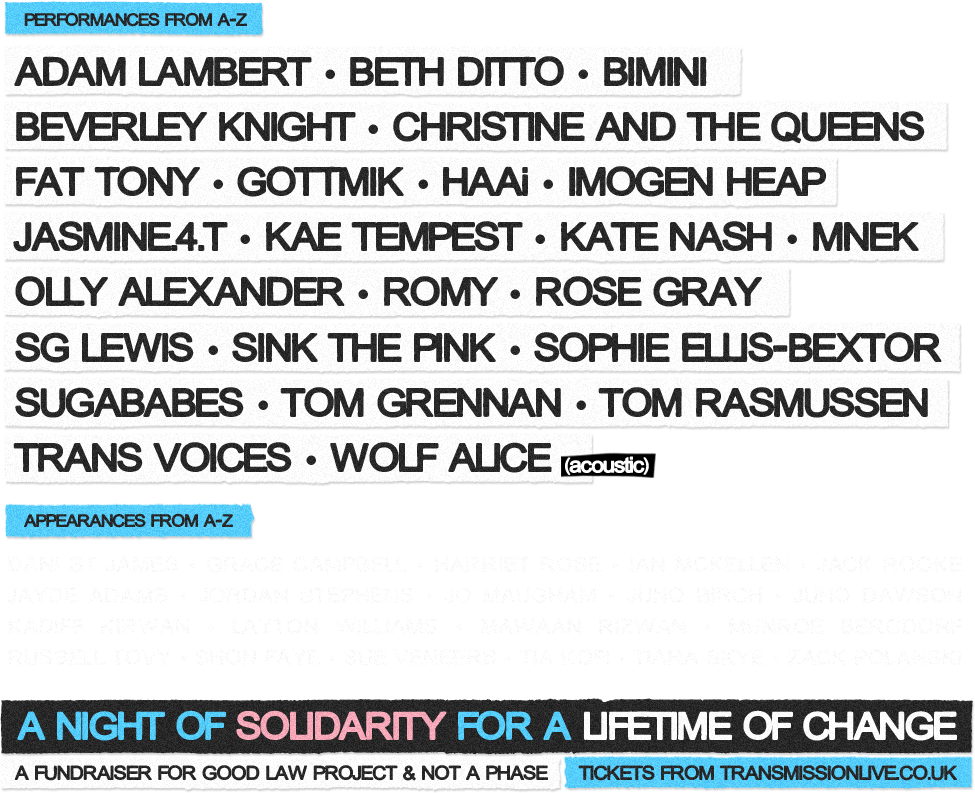 Can’t make the event? 100% of donations on this page will be split 50/50 between Not A Phase (charity no. 1193381) and Good Law Project (non-profit company no. 10556197) who provide incredible support to the community 365 days a year. £10.00 £20.00 £30.00 £40.00 Custom Amount Please enter an amount £ One-Time Donation Weekly Donation Monthly Donation Quarterly Donation Annual Donation Support us by covering the fees we have to pay 3% Cover the Fee Donate Donate terms & conditions // privacy policy